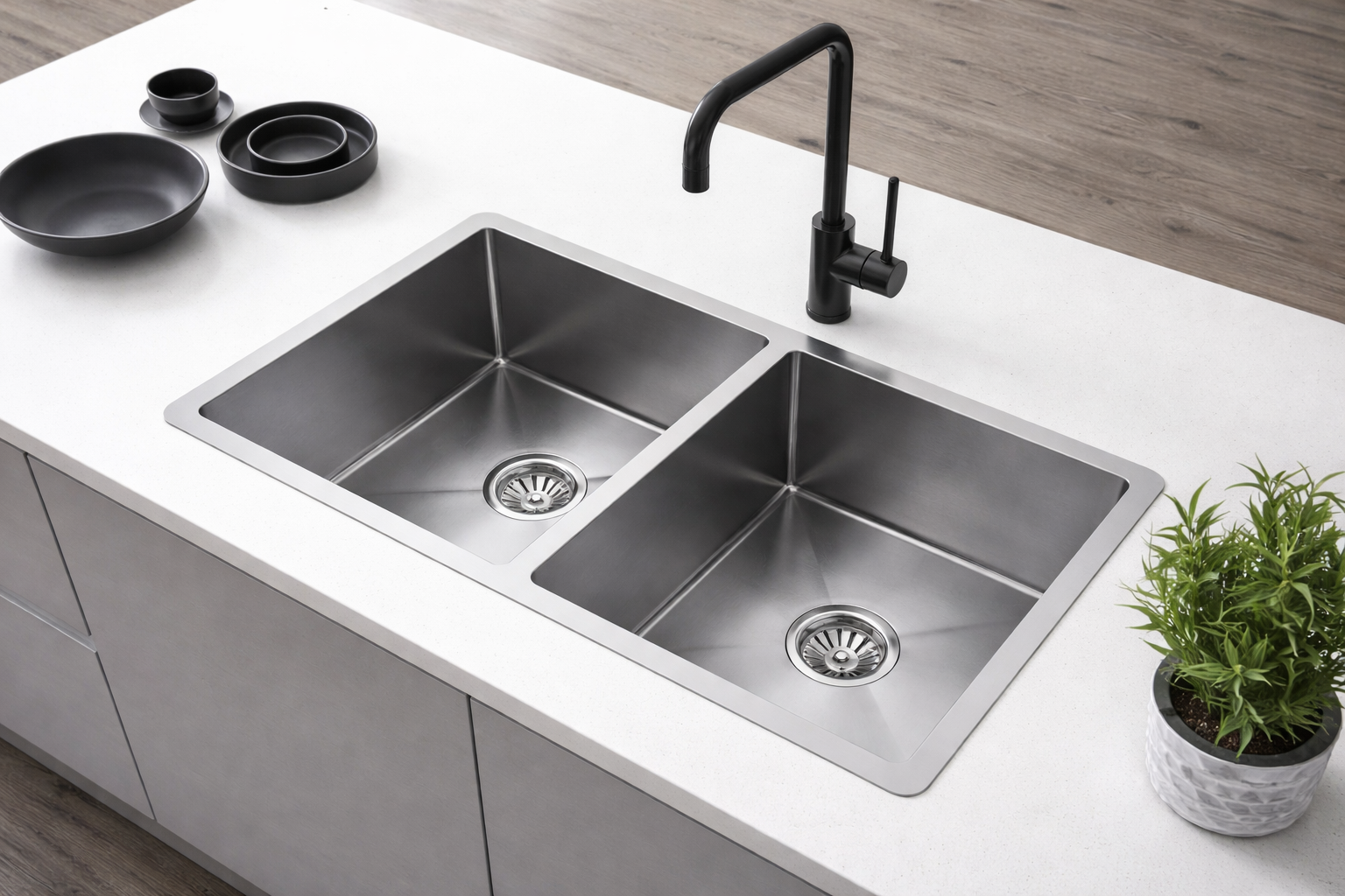 The DOUBLE BOWL Collection sink (32 × 18 × 9 inches) by JBSCO features an overall size of 750 × 450 × 225 mm with two equal bowl sizes of 400 × 362.5 mm each, offering a highly functional solution for modern kitchens. Crafted from 1.2 mm thick 304-grade stainless steel with 8% nickel, it provides outstanding durability and strong resistance to rust and corrosion. The brushed matte finish adds a sleek and contemporary look, while smooth rounded corners help reduce grime build-up and make cleaning easier.