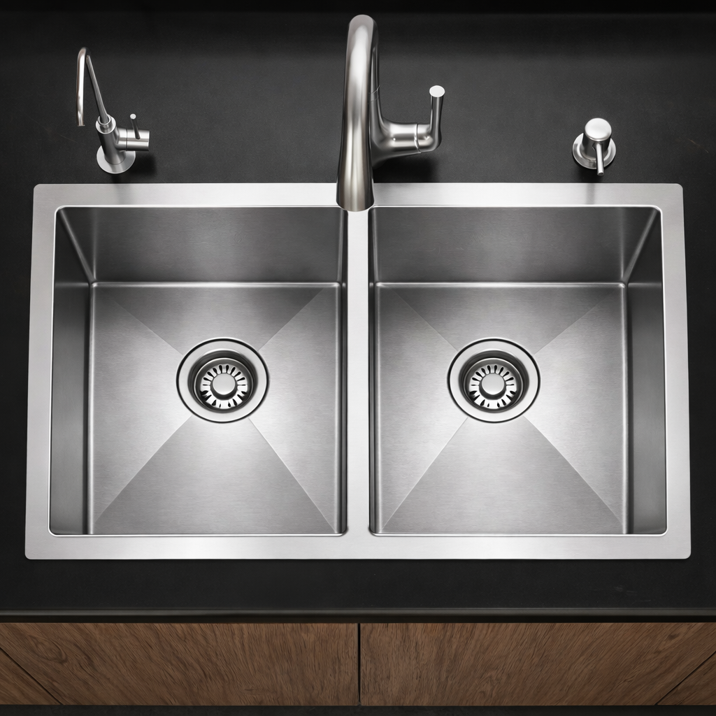 The DOUBLE BOWL Collection sink (40 × 20 × 9 inches) by JBSCO features an overall size of 1000 × 500 × 225 mm with two equal bowl sizes of 462.5 × 450 mm each, providing a spacious and efficient solution for modern kitchens. Made from 1.2 mm thick 304-grade stainless steel with 8% nickel, it offers excellent durability along with strong resistance to rust and corrosion. The brushed matte finish gives the sink a sleek and contemporary look, while smooth rounded corners help prevent grime build-up and make cleaning easier.