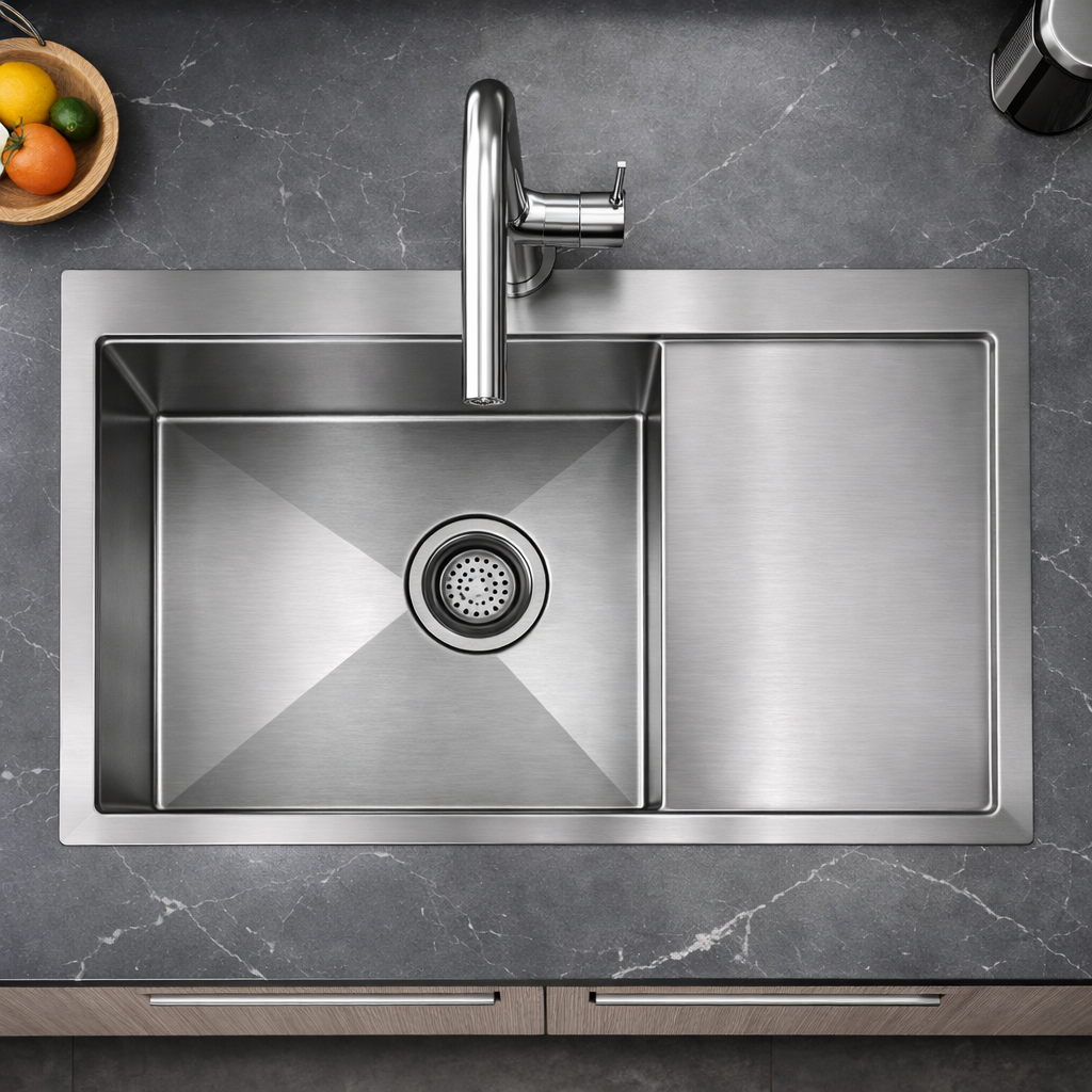 The DRAIN Collection sink (40 × 20 × 9 inches) by JBSCO features an overall size of 1000 × 500 × 225 mm with a bowl size of 525 × 400 mm, offering a spacious and practical solution for modern kitchens. Crafted from 1.2 mm thick 304-grade stainless steel with 8% nickel, it ensures excellent durability and strong resistance to rust and corrosion. The brushed matte finish gives the sink a sleek and modern look, while smooth rounded corners make cleaning easier and help reduce grime build-up.